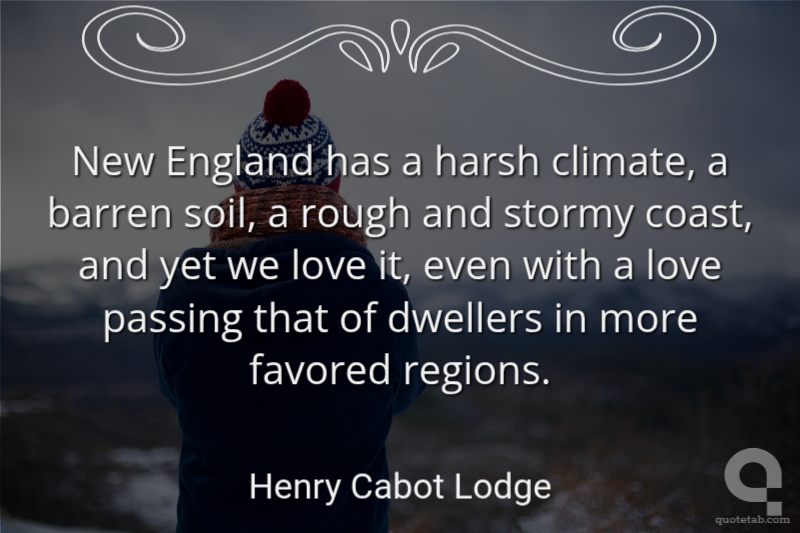 New England has a harsh climate, a barren soil, a rough and stormy coast, and yet we love it, even with a love passing that of dwellers in more favored regions. Henry Cabot Lodge
