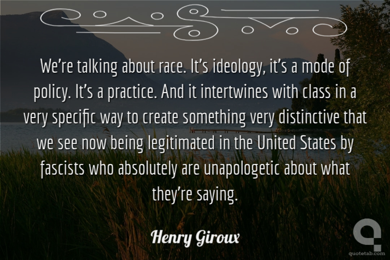 We're talking about race. It's ideology, it's a mode of policy. It's a practice. And it intertwines with class in a very specific way to create something very distinctive that we see now being legitimated in the United States by fascists who absolutely are unapologetic about what they're saying. Henry Giroux