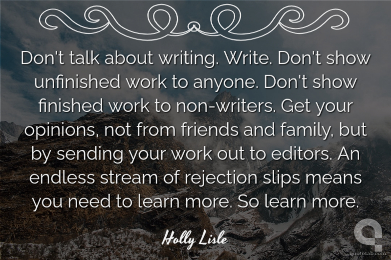 Don't talk about writing. Write. Don't show unfinished work to anyone. Don't show finished work to non-writers. Get your opinions, not from friends and family, but by sending your work out to editors. An endless stream of rejection slips means you need to learn more. So learn more. Holly Lisle