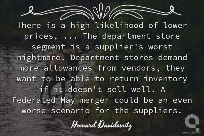 There is a high likelihood of lower prices, ... The department store segment is a supplier's worst nightmare. Department stores demand more allowances from vendors, they want to be able to return inventory if it doesn't sell well. A Federated-May merger could be an even worse scenario for the suppliers. Howard Davidowitz