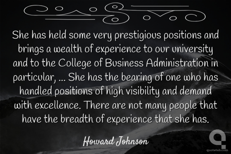 She has held some very prestigious positions and brings a wealth of experience to our university and to the College of Business Administration in particular, ... She has the bearing of one who has handled positions of high visibility and demand with excellence. There are not many people that have the breadth of experience that she has. Howard Johnson