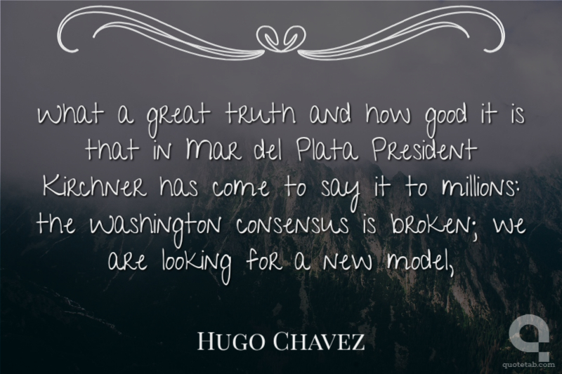 What a great truth and how good it is that in Mar del Plata President Kirchner has come to say it to millions: the Washington consensus is broken; we are looking for a new model, Hugo Chavez