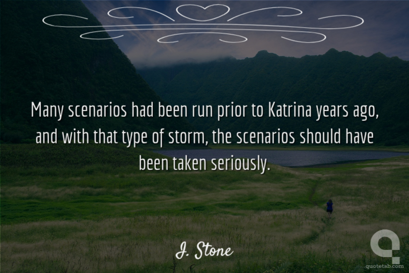 Many scenarios had been run prior to Katrina years ago, and with that type of storm, the scenarios should have been taken seriously. I. Stone
