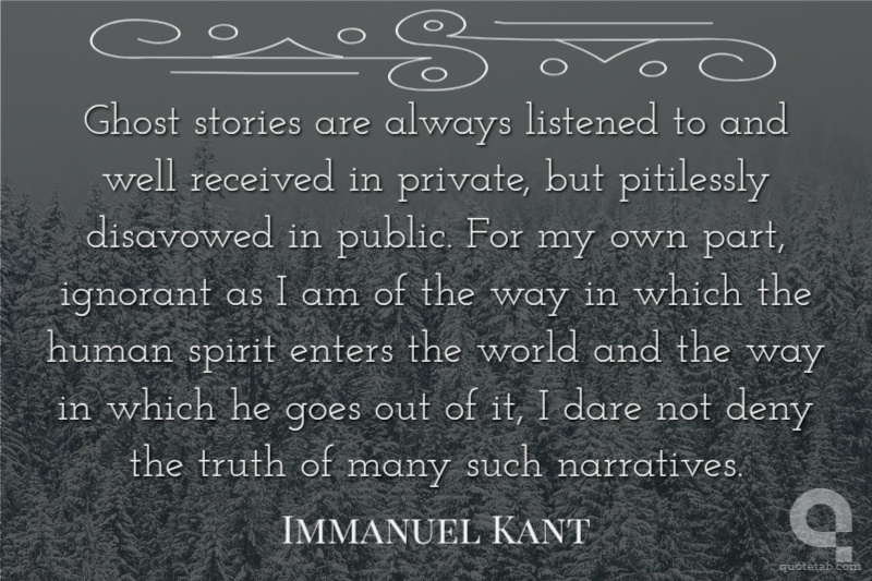 Ghost stories are always listened to and well received in private, but pitilessly disavowed in public. For my own part, ignorant as I am of the way in which the human spirit enters the world and the way in which he goes out of it, I dare not deny the truth of many such narratives. Immanuel Kant