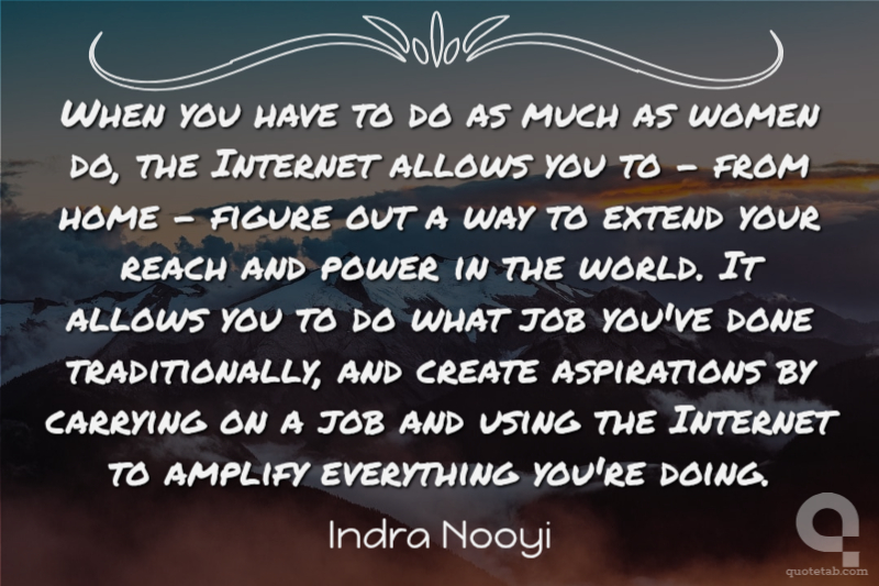 When you have to do as much as women do, the Internet allows you to - from home - figure out a way to extend your reach and power in the world. It allows you to do what job you've done traditionally, and create aspirations by carrying on a job and using the Internet to amplify everything you're doing. Indra Nooyi