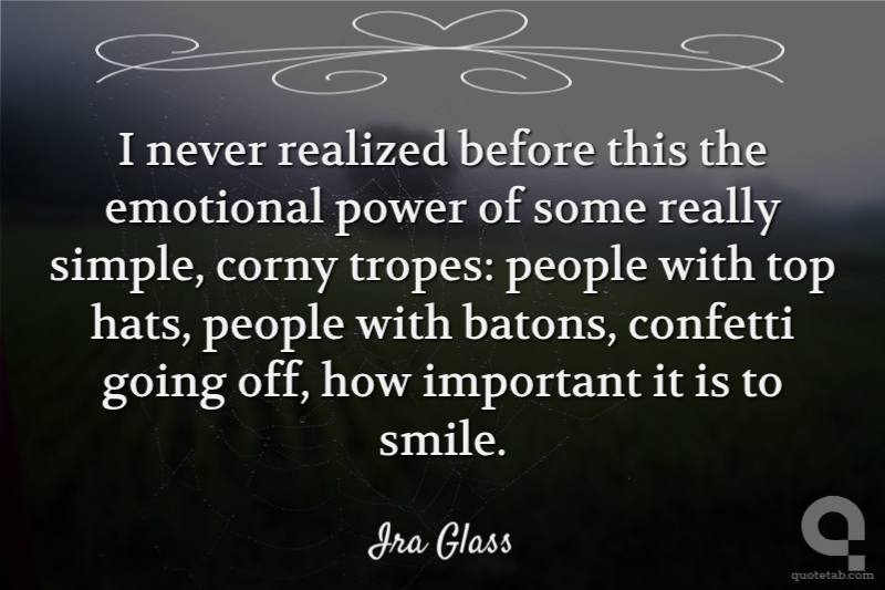 I never realized before this the emotional power of some really simple, corny tropes: people with top hats, people with batons, confetti going off, how important it is to smile. Ira Glass