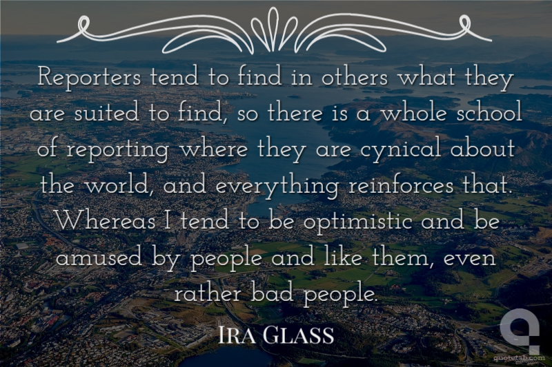 Reporters tend to find in others what they are suited to find, so there is a whole school of reporting where they are cynical about the world, and everything reinforces that. Whereas I tend to be optimistic and be amused by people and like them, even rather bad people. Ira Glass