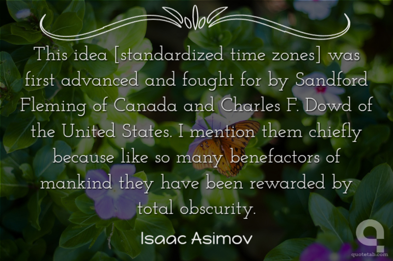 This idea [standardized time zones] was first advanced and fought for by Sandford Fleming of Canada and Charles F. Dowd of the United States. I mention them chiefly because like so many benefactors of mankind they have been rewarded by total obscurity. Isaac Asimov