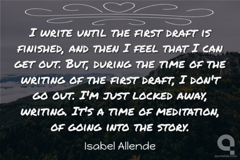 I write until the first draft is finished, and then I feel that I can get out. But, during the time of the writing of the first draft, I don't go out. I'm just locked away, writing. It's a time of meditation, of going into the story. Isabel Allende