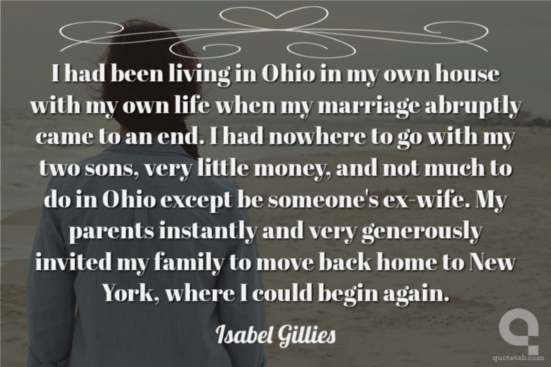 I had been living in Ohio in my own house with my own life when my marriage abruptly came to an end. I had nowhere to go with my two sons, very little money, and not much to do in Ohio except be someone's ex-wife. My parents instantly and very generously invited my family to move back home to New York, where I could begin again. Isabel Gillies