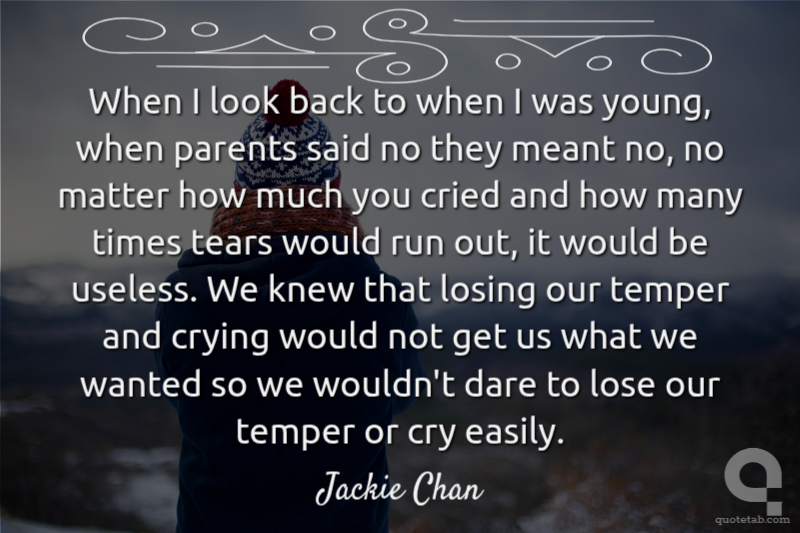 When I look back to when I was young, when parents said no they meant no, no matter how much you cried and how many times tears would run out, it would be useless. We knew that losing our temper and crying would not get us what we wanted so we wouldn't dare to lose our temper or cry easily. Jackie Chan