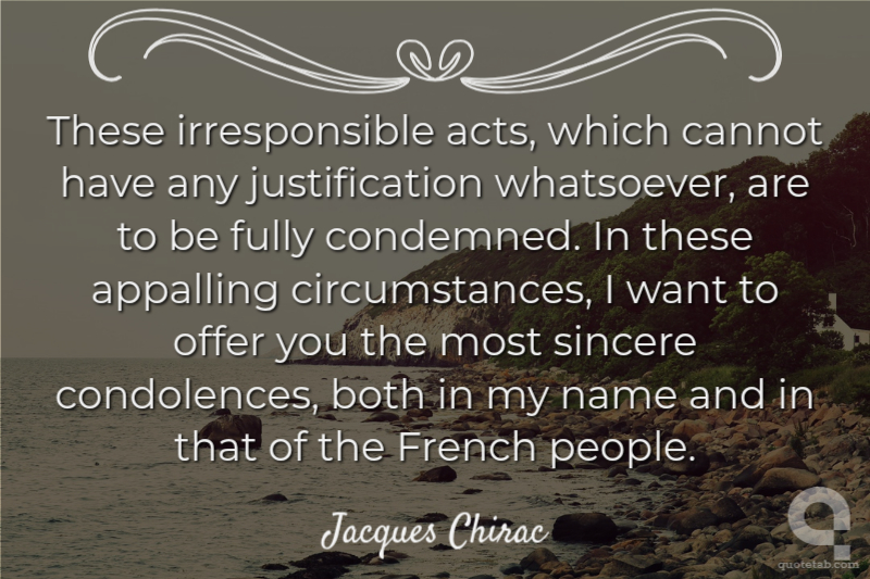 These irresponsible acts, which cannot have any justification whatsoever, are to be fully condemned. In these appalling circumstances, I want to offer you the most sincere condolences, both in my name and in that of the French people. Jacques Chirac