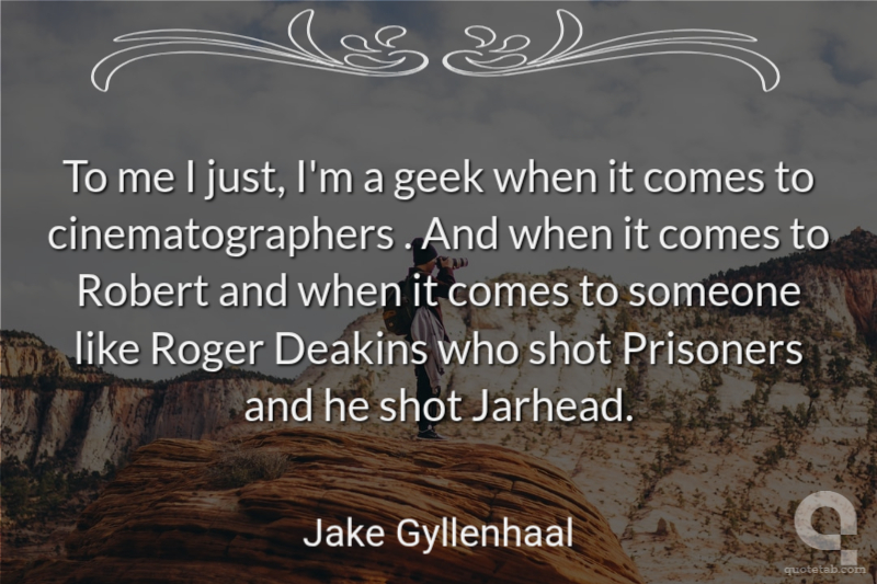 To me I just, I'm a geek when it comes to cinematographers . And when it comes to Robert and when it comes to someone like Roger Deakins who shot Prisoners and he shot Jarhead. Jake Gyllenhaal