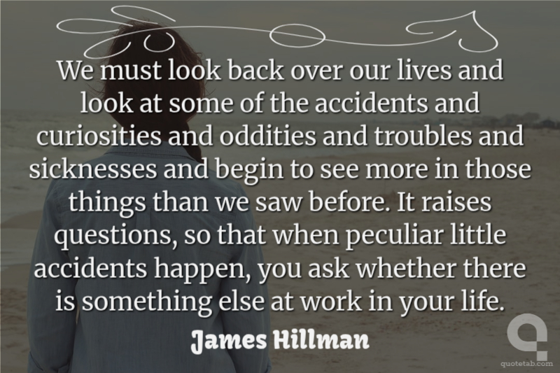 We must look back over our lives and look at some of the accidents and curiosities and oddities and troubles and sicknesses and begin to see more in those things than we saw before. It raises questions, so that when peculiar little accidents happen, you ask whether there is something else at work in your life. James Hillman