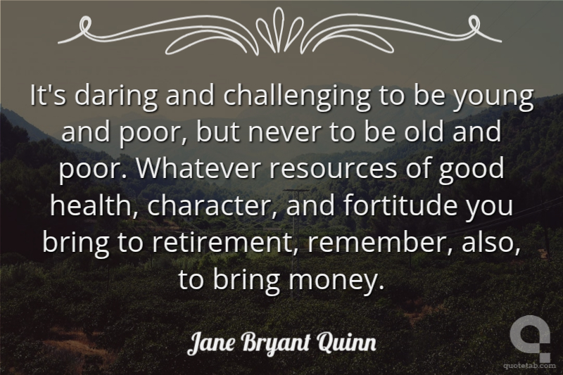 It's daring and challenging to be young and poor, but never to be old and poor. Whatever resources of good health, character, and fortitude you bring to retirement, remember, also, to bring money. Jane Bryant Quinn