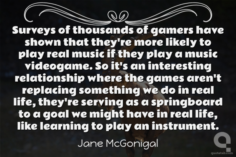 Surveys of thousands of gamers have shown that they're more likely to play real music if they play a music videogame. So it's an interesting relationship where the games aren't replacing something we do in real life, they're serving as a springboard to a goal we might have in real life, like learning to play an instrument. Jane McGonigal