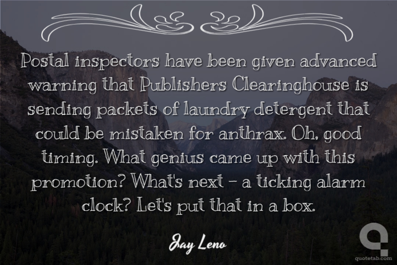 Postal inspectors have been given advanced warning that Publishers Clearinghouse is sending packets of laundry detergent that could be mistaken for anthrax. Oh, good timing. What genius came up with this promotion? What's next - a ticking alarm clock? Let's put that in a box. Jay Leno
