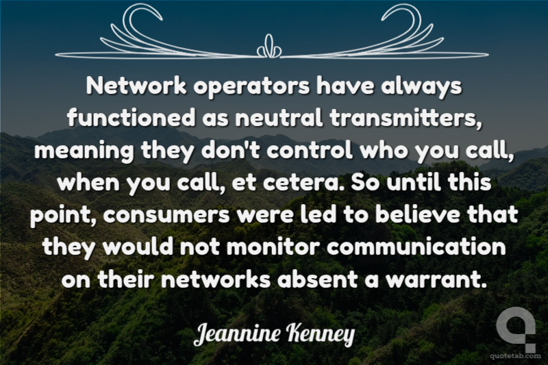 Network operators have always functioned as neutral transmitters, meaning they don't control who you call, when you call, et cetera. So until this point, consumers were led to believe that they would not monitor communication on their networks absent a warrant. Jeannine Kenney