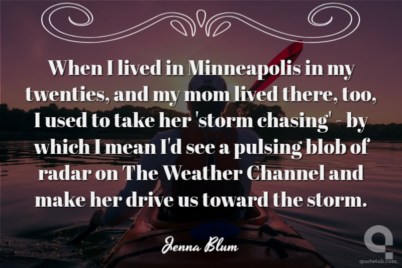 When I lived in Minneapolis in my twenties, and my mom lived there, too, I used to take her 'storm chasing' - by which I mean I'd see a pulsing blob of radar on The Weather Channel and make her drive us toward the storm. Jenna Blum