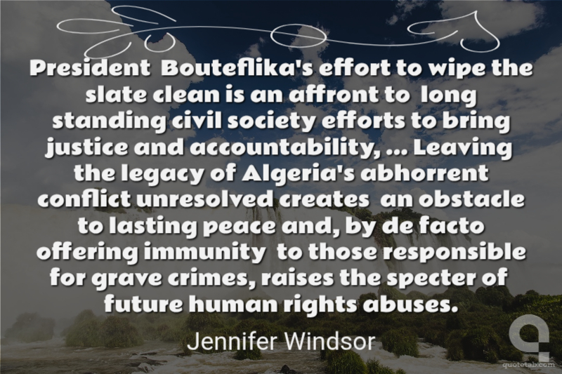 President Bouteflika's effort to wipe the slate clean is an affront to long standing civil society efforts to bring justice and accountability, ... Leaving the legacy of Algeria's abhorrent conflict unresolved creates an obstacle to lasting peace and, by de facto offering immunity to those responsible for grave crimes, raises the specter of future human rights abuses. Jennifer Windsor