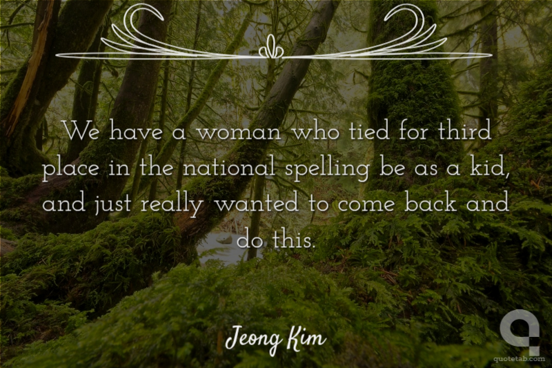 We have a woman who tied for third place in the national spelling be as a kid, and just really wanted to come back and do this. Jeong Kim