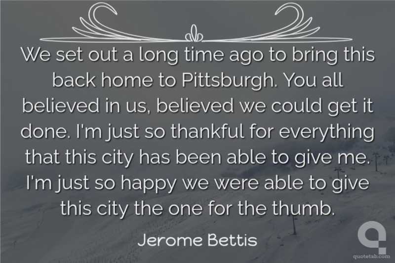 We set out a long time ago to bring this back home to Pittsburgh. You all believed in us, believed we could get it done. I'm just so thankful for everything that this city has been able to give me. I'm just so happy we were able to give this city the one for the thumb. Jerome Bettis