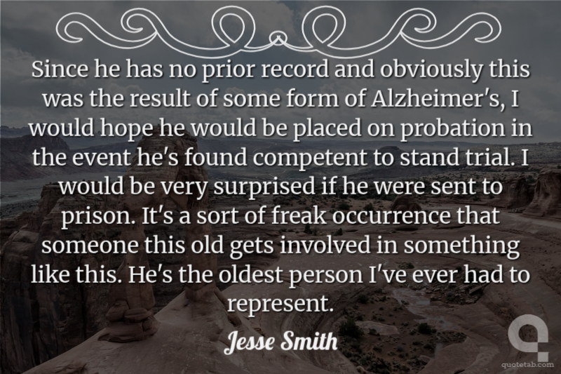 Since he has no prior record and obviously this was the result of some form of Alzheimer's, I would hope he would be placed on probation in the event he's found competent to stand trial. I would be very surprised if he were sent to prison. It's a sort of freak occurrence that someone this old gets involved in something like this. He's the oldest person I've ever had to represent. Jesse Smith