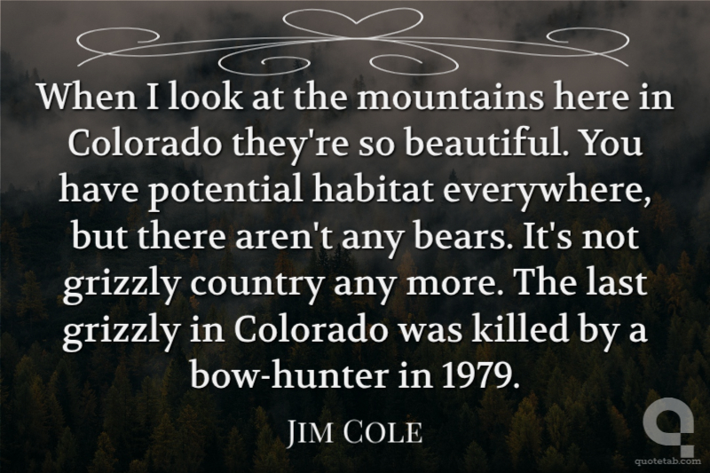 When I look at the mountains here in Colorado they're so beautiful. You have potential habitat everywhere, but there aren't any bears. It's not grizzly country any more. The last grizzly in Colorado was killed by a bow-hunter in 1979. Jim Cole
