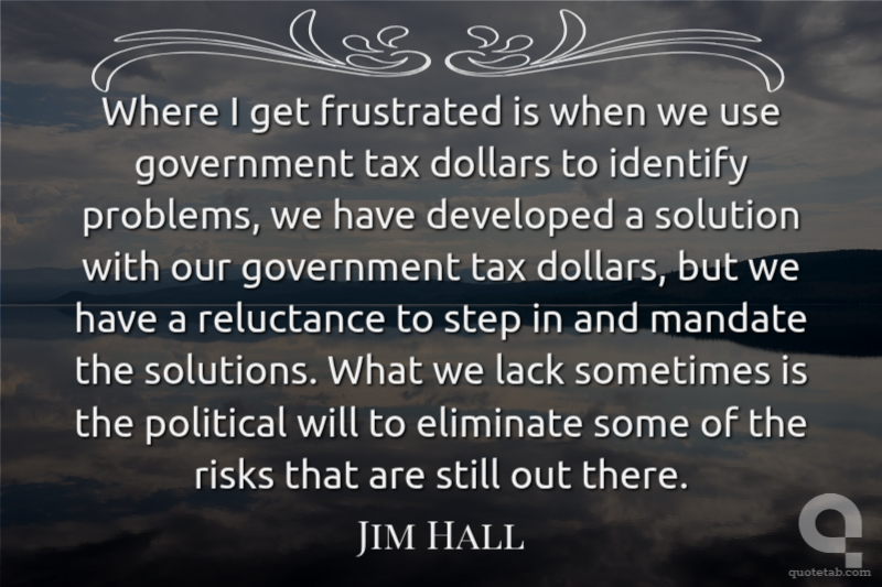 Where I get frustrated is when we use government tax dollars to identify problems, we have developed a solution with our government tax dollars, but we have a reluctance to step in and mandate the solutions. What we lack sometimes is the political will to eliminate some of the risks that are still out there. Jim Hall