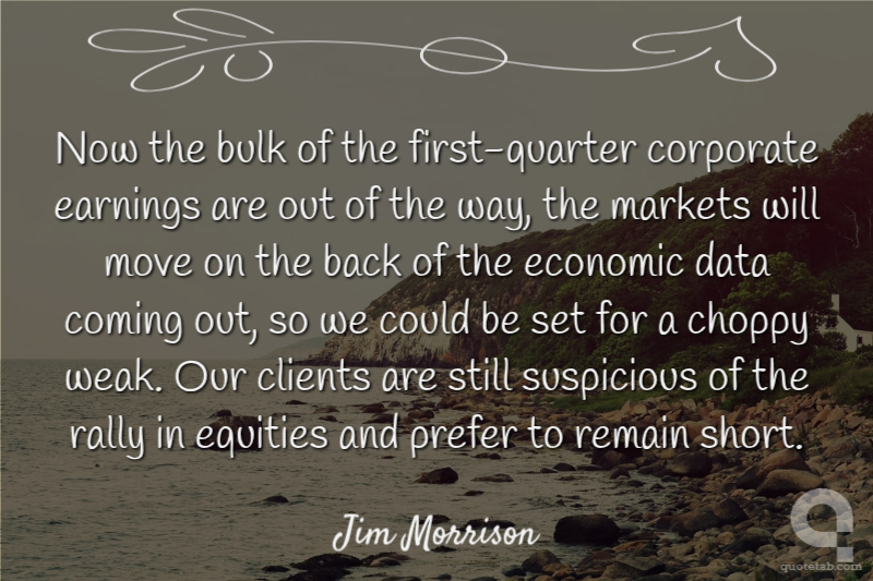 Now the bulk of the first-quarter corporate earnings are out of the way, the markets will move on the back of the economic data coming out, so we could be set for a choppy weak. Our clients are still suspicious of the rally in equities and prefer to remain short. Jim Morrison