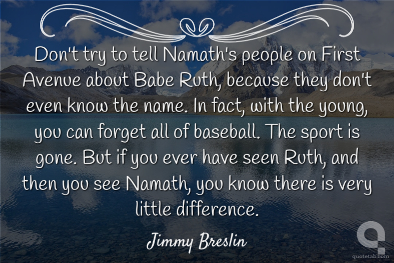 Don't try to tell Namath's people on First Avenue about Babe Ruth, because they don't even know the name. In fact, with the young, you can forget all of baseball. The sport is gone. But if you ever have seen Ruth, and then you see Namath, you know there is very little difference. Jimmy Breslin