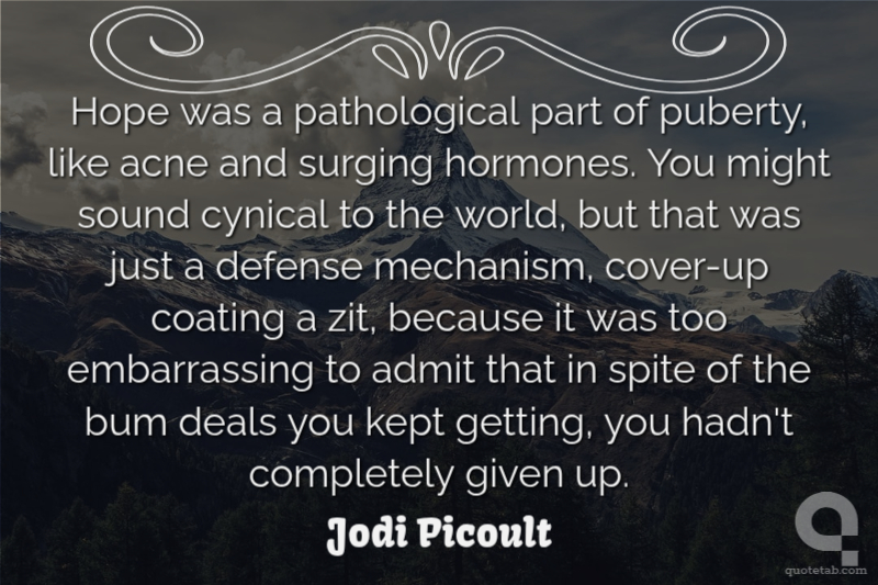 Hope was a pathological part of puberty, like acne and surging hormones. You might sound cynical to the world, but that was just a defense mechanism, cover-up coating a zit, because it was too embarrassing to admit that in spite of the bum deals you kept getting, you hadn't completely given up. Jodi Picoult