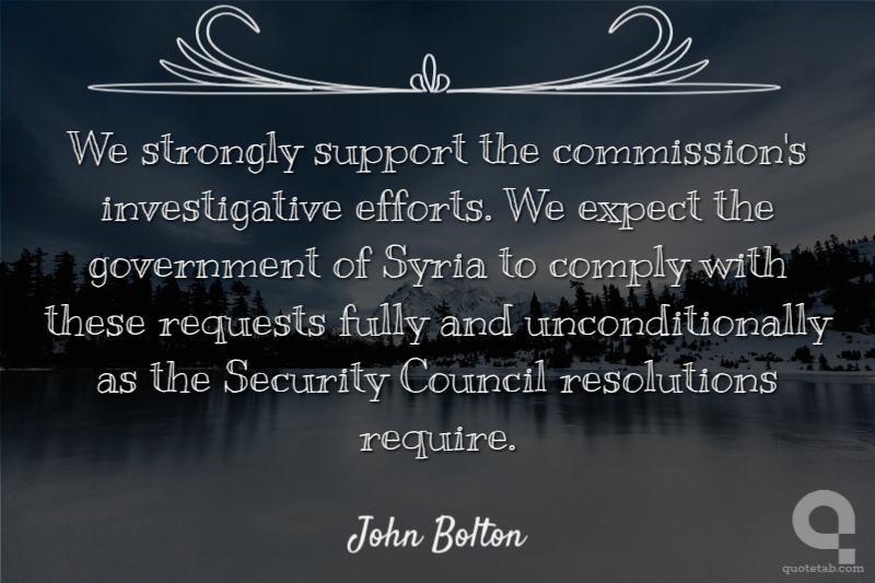 We strongly support the commission's investigative efforts. We expect the government of Syria to comply with these requests fully and unconditionally as the Security Council resolutions require. John Bolton