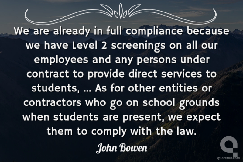 We are already in full compliance because we have Level 2 screenings on all our employees and any persons under contract to provide direct services to students, ... As for other entities or contractors who go on school grounds when students are present, we expect them to comply with the law. John Bowen