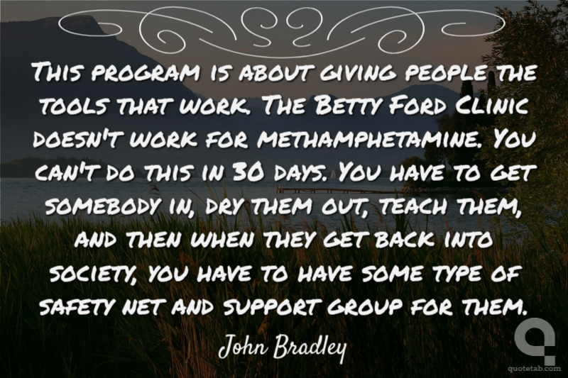 This program is about giving people the tools that work. The Betty Ford Clinic doesn't work for methamphetamine. You can't do this in 30 days. You have to get somebody in, dry them out, teach them, and then when they get back into society, you have to have some type of safety net and support group for them. John Bradley