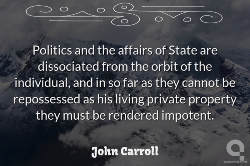 Politics and the affairs of State are dissociated from the orbit of the individual, and in so far as they cannot be repossessed as his living private property they must be rendered impotent. John Carroll