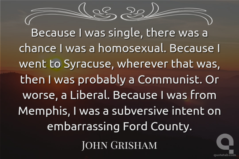 Because I was single, there was a chance I was a homosexual. Because I went to Syracuse, wherever that was, then I was probably a Communist. Or worse, a Liberal. Because I was from Memphis, I was a subversive intent on embarrassing Ford County. John Grisham
