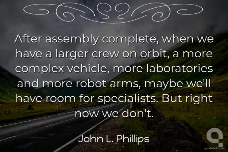 After assembly complete, when we have a larger crew on orbit, a more complex vehicle, more laboratories and more robot arms, maybe we'll have room for specialists. But right now we don't. John L. Phillips