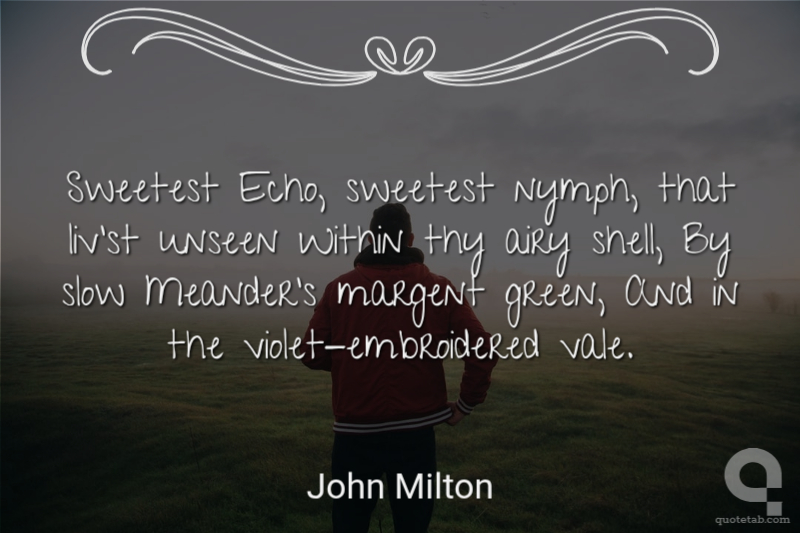 Sweetest Echo, sweetest nymph, that liv'st unseen Within thy airy shell, By slow Meander's margent green, And in the violet-embroidered vale. John Milton