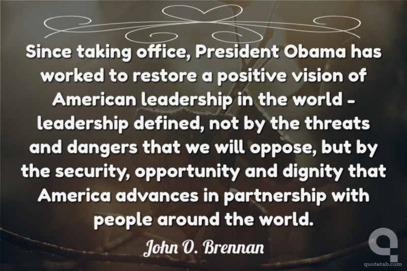 Since taking office, President Obama has worked to restore a positive vision of American leadership in the world - leadership defined, not by the threats and dangers that we will oppose, but by the security, opportunity and dignity that America advances in partnership with people around the world. John O. Brennan