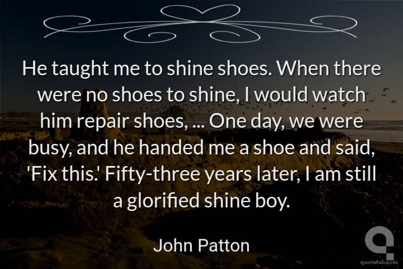 He taught me to shine shoes. When there were no shoes to shine, I would watch him repair shoes, ... One day, we were busy, and he handed me a shoe and said, 'Fix this.' Fifty-three years later, I am still a glorified shine boy. John Patton