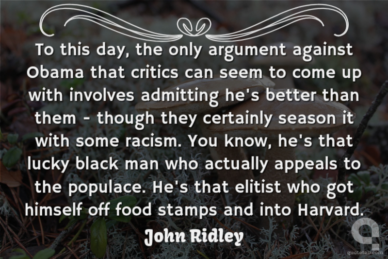 To this day, the only argument against Obama that critics can seem to come up with involves admitting he's better than them - though they certainly season it with some racism. You know, he's that lucky black man who actually appeals to the populace. He's that elitist who got himself off food stamps and into Harvard. John Ridley