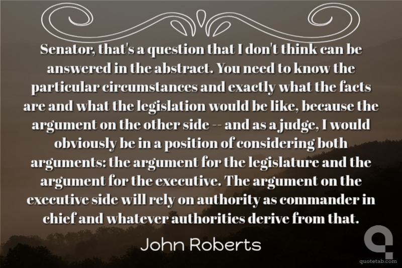 Senator, that's a question that I don't think can be answered in the abstract. You need to know the particular circumstances and exactly what the facts are and what the legislation would be like, because the argument on the other side -- and as a judge, I would obviously be in a position of considering both arguments: the argument for the legislature and the argument for the executive. The argument on the executive side will rely on authority as commander in chief and whatever authorities derive from that. John Roberts