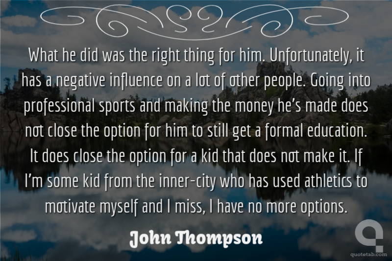 What he did was the right thing for him. Unfortunately, it has a negative influence on a lot of other people. Going into professional sports and making the money he's made does not close the option for him to still get a formal education. It does close the option for a kid that does not make it. If I'm some kid from the inner-city who has used athletics to motivate myself and I miss, I have no more options. John Thompson