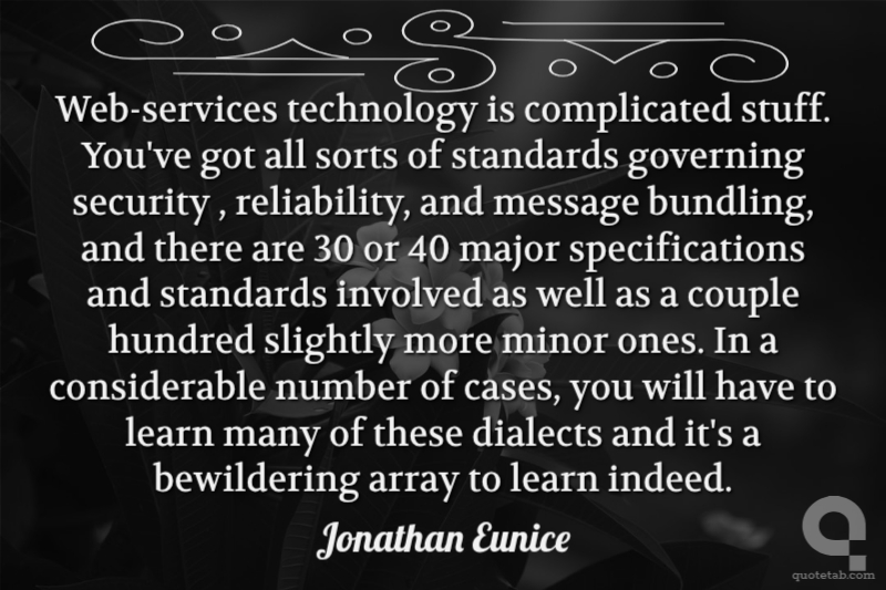 Web-services technology is complicated stuff. You've got all sorts of standards governing security , reliability, and message bundling, and there are 30 or 40 major specifications and standards involved as well as a couple hundred slightly more minor ones. In a considerable number of cases, you will have to learn many of these dialects and it's a bewildering array to learn indeed. Jonathan Eunice