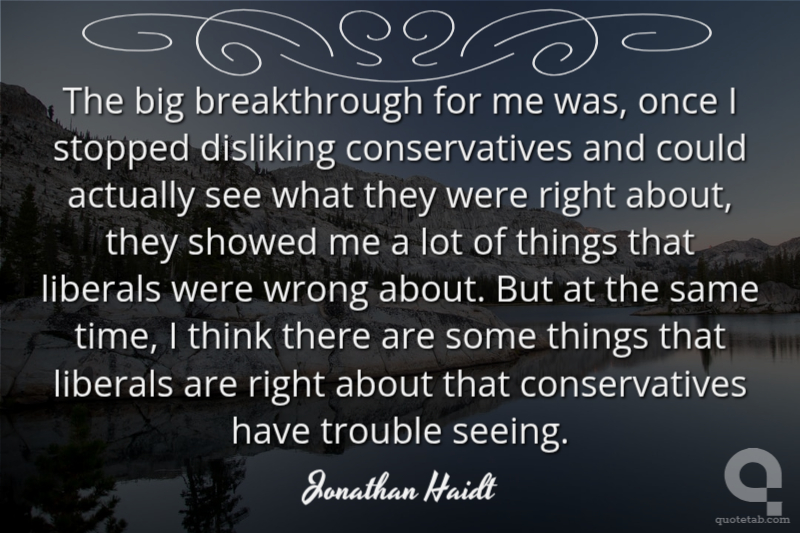The big breakthrough for me was, once I stopped disliking conservatives and could actually see what they were right about, they showed me a lot of things that liberals were wrong about. But at the same time, I think there are some things that liberals are right about that conservatives have trouble seeing. Jonathan Haidt