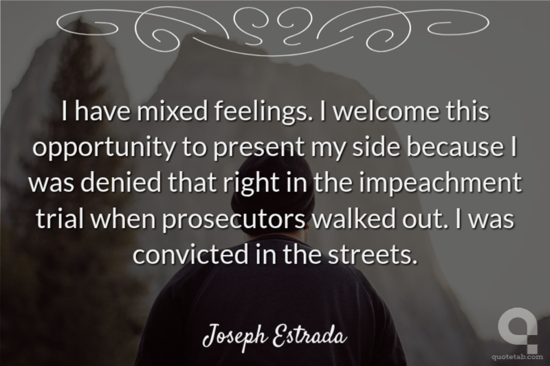 I have mixed feelings. I welcome this opportunity to present my side because I was denied that right in the impeachment trial when prosecutors walked out. I was convicted in the streets. Joseph Estrada