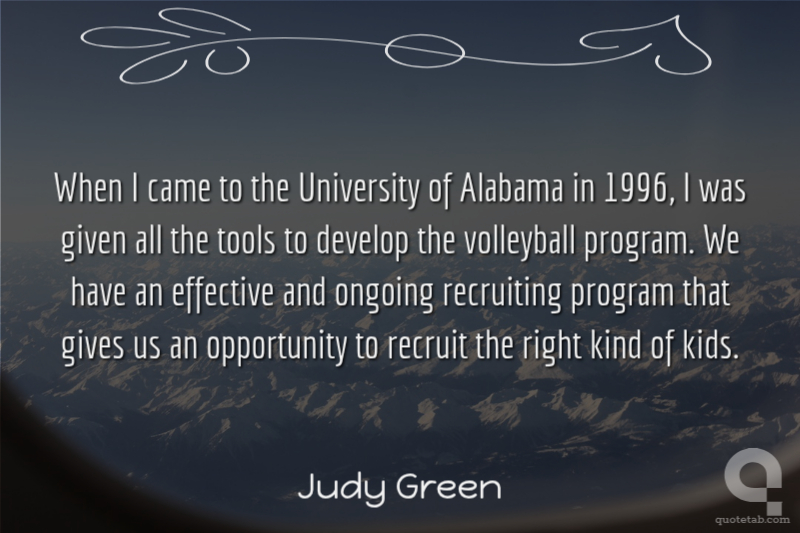 When I came to the University of Alabama in 1996, I was given all the tools to develop the volleyball program. We have an effective and ongoing recruiting program that gives us an opportunity to recruit the right kind of kids. Judy Green