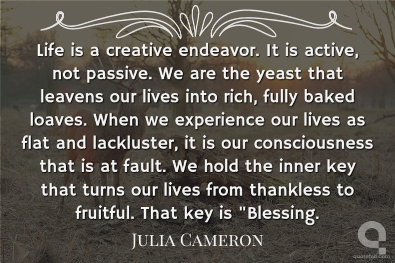 Life is a creative endeavor. It is active, not passive. We are the yeast that leavens our lives into rich, fully baked loaves. When we experience our lives as flat and lackluster, it is our consciousness that is at fault. We hold the inner key that turns our lives from thankless to fruitful. That key is "Blessing. Julia Cameron
