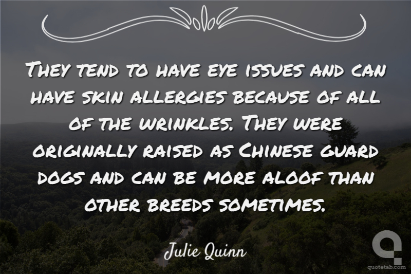 They tend to have eye issues and can have skin allergies because of all of the wrinkles. They were originally raised as Chinese guard dogs and can be more aloof than other breeds sometimes. Julie Quinn